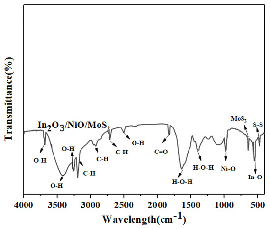 The FTIR spectrum of In2O3/NiO/MoS2 hybrid nanoparticles is shown in Figure 4. The strong peak at 543 cm−1 is attributed to the presence of In-O bending vibration. The absorption peak at 1640 cm−1 is assigned to H-O-H bending vibrational strains. The peak at 3461 cm−1 belongs to the vibrational stretching of hydroxyl groups, which is due to the presence of water on the surface of nanoparticles [19]. The band at 2700 indicates the C-H group in the sample. After coating with NiO nanoparticles, the peak at 991 cm−1 is attributed to the vibrational stretching of Ni-O. In addition, the absorption bands at 1818, 3271, 3146, and 3685 are attributed to the vibrational stretching of C=O, C-H, O-H, and O-H, respectively, in the sample. The absorption peak at 1362 cm−1 is assigned to H-O-H bending vibrational strains at the nanoparticle surface. Peak 368 indicates the presence of In2O3/NiO/MoS2 nanoparticles [20,21]. The absorption peak at 484 cm−1 is due to the S bond and in S-S [23]. In addition, the peak in the range of 2914 cm−1 is related to the C-H stretching mode on the surface of the sample. Therefore, the FTIR spectrum confirms the composition of In2O3/NiO/MoS2.