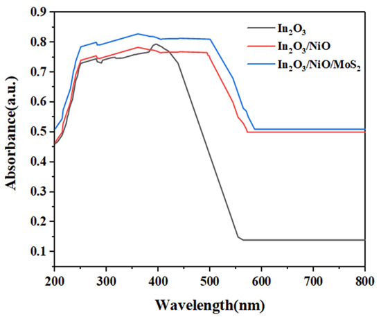 The optical characteristics of In2O3, In2O3/NiO, and In2O3/NiO/MoS2 nanoparticles are depicted in Figure 5. The optical absorption curve of In2O3 indicated a peak in the range of 250–600 nm. By modifying NiO in In2O3, the optical absorption of modified nanoparticle In2O3/NiO significantly increased. The optical absorption spectrum for In2O3/NiO/MoS2 demonstrated the highest absorption compared to In2O3 and In2O3/NiO. The optical absorption studies indicated significant improvement in modified nanoparticles compared to In2O3 alone [24]. As can be seen, the modification of nanoparticles narrowed the band gap in In2O3/NiO/MoS2 compared to In2O3. The band gap calculated for In2O3, In2O3/NiO, and In2O3/NiO/MoS2 samples was 2.27 eV, 1.91 eV, and 1.82 eV, respectively.