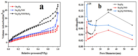 (a) Pore size distribution plots of N2 adsorption-desorption isotherm and (b) BJH of In2O3, In2O3/NiO, and In2O3/NiO/MoS2 nanocomposites.