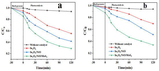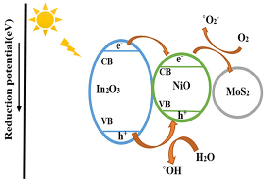 Indium oxide (In2O3) is an important n-type semiconductor and has three phases: hexagonal, cubic, and hexagonal corundum. Recently, In2O3 has been widely used in solar cells, sensor modules, and transparent electrode materials for electrochromic cells and for liquid crystal display devices, thin film transistors, light-emitting diodes, and flat panel displays. The main advantages of In2O3 for use in photocatalysis include environmental stability, high photosensitivity, and an efficient sensitizer to expand the absorption spectrum of metal oxide-based semiconductor photocatalysts from the UV to the visible spectrum. Its weakness is the quick recombination of electrons and holes caused by being photo-induced [11]. The coupling of In2O3 with NiO leads to the facilitation of charge separation via electron trapping by Ni3+ ions. NiO is a relatively low-cost material, with low toxicity and high chemical and thermal stability applied in various fields, including photocatalysts, magnetic materials, lithium-ion batteries, adsorbents, gas sensors, and electrochromic devices. The photocatalytic attributes of NiO are used to degrade organic contaminations such as Rhodamine B (RhB) and methylene blue (MB) [12]. These studies were carried out under UV irradiation because the vast band gap of NiO (4–3.6 eV) prevents photocatalytic activity under visible light. In addition, the quick recombination of electron-hole pairs is another impediment reported to limit the efficiency of NiO [13]. Molybdenum disulfide (MoS2), a type of two-dimensional layered transition metal dichalcogenide, has inimitable advantages in photocatalysis in terms of inimitable chemical, physical, and electrical attributes and a tunable band structure. MoS2 is a well-known material with a layered structure similar to graphene, which has distinct physical and chemical properties [14]. Due to its narrow band gap (1.7 eV), nanoscale MoS2 is recognized as a potential photocatalyst that has excellent properties, such as superior conductivity, photostability, and catalytic activity [15]. The incorporation of MoS2 into metal oxide nanoparticles can be effective in order to create electron-hole pair transfer, enhancing light emission, and, at the same time, reducing the band gap [14]. Therefore, MoS2 plays a role similar to noble metals because MoS2 nanoparticles can act as electron collectors and are still effective in electron-hole pair separation [16].