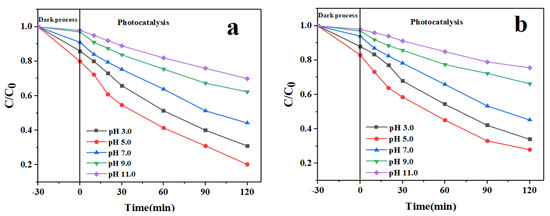 The effect of pH on the photocatalytic degradation of the drug, (a) for IMA and (b) for FU-5.