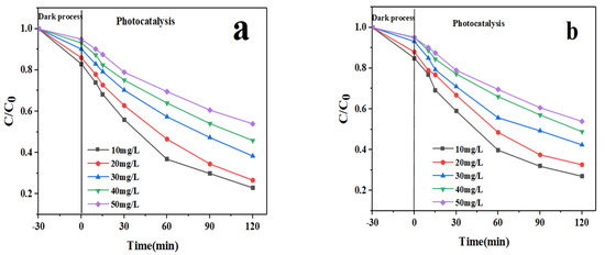 Effects of the initial pollutant concentration on the photocatalytic degradation of the drug (a): IMA and (b): FU-5.