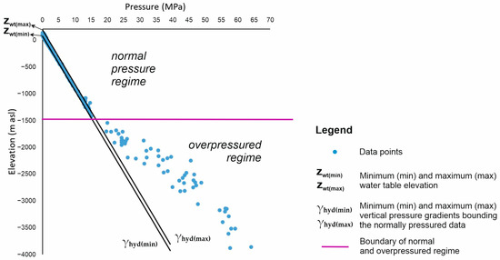 Accordingly, all pressure data were displayed on one p(z) profile. The zwt(max) or hmax value was approximated by the maximum land surface elevation as hmax = 190 m asl, whilst the zwt(min) or hmin by the minimum land surface elevation as hmin = 70 m asl. The values of γhyd(max) and γhyd(min) are equal to 9.81 MPa/km (with a water density of 1000 kg/m3 explained in Section 3.2) and start from the hmax = zwt(max) = 190 m asl and hmin = zwt(min) = 70 m asl values, respectively.