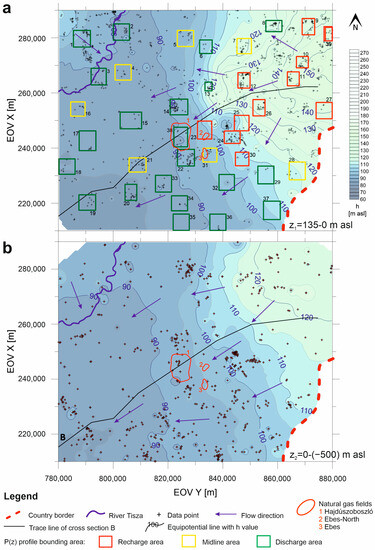 Among the hydraulic cross sections, “B” is presented (Figure 8) which runs along the regional hydraulic gradient of the topography-driven flow system (based on Figure 5) and across the Hajdúszoboszló gas field. Based on its interpretation in combination with the p(z) profile and tomographic fluid potential map analyses, three flow domains can be separated in the northeastern half of the section (and the study area), whilst in the southwestern half, only two flow domains can be clearly separated.