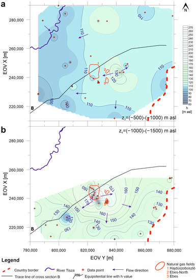 In the deeper maps below z = (−500) m asl (Figure 6 and Figure 7), data distribution becomes sporadic and thus limits conclusions. What can still be determined is the downward increase in hydraulic head values (Figure 6), and moreover, a leap of magnitude below about z = (−1500) m asl (Figure 7) in the southern part of the area where data were available. These results are also in concordance with the p(z) profile interpretations (Section 4.1). Namely, data between z = (−500) and (−1500) m asl (Figure 6) represent a transition zone where still normal pressure regime but independence from the topographical conditions (i.e., from water table relief) can be observed. On the other hand, data below z = (−1500) m asl (Figure 7) already represent the overpressured regime. Finally, it is worth emphasizing that a positive anomaly can be observed around the Hajdúszoboszló gas field in the z4 = (−1000)–(−1500) m asl elevation interval (Figure 6b).
