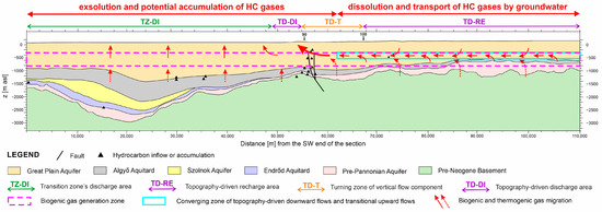 The basin-scale hydraulic evaluation of measured data revealed the most favorable hydrodynamic conditions for hydrocarbon entrapment in the study area around the Hajdúszoboszló gas field (Figure 8 and Figure 9). Namely, groundwater is transported towards southwest also within the topography-driven flow systems and in the transition zone where upward flows are deflected southwestward in the converging (i.e., hydraulic trap) zone of the two flow domains. The vertical flow component of the topography-driven system changes from downward to upward in the turning zone (TD-T) where the horizontal hydraulic gradient also sharply decreases. These hydrodynamic conditions especially favor hydrocarbon entrapment. Namely, if there is available gas (whether biogenic or thermogenic) in the recharge basin part which can be dissolved by groundwater, then it will be transported in aqueous solution by flowing groundwater and gathered in the converging (i.e., hydraulic trap) zone which further conveys it southwestward (Figure 9). This gathering and focused horizontal migration of dissolved gases is taking place southwestward until a remarkable decrease in pressure and temperature takes place. As a result, decreasing pressure decreases, whilst decreasing temperature increases methane solubility in the temperature range below about 90 °C where biogenic gas systems operate. However, due to the usually dominating influence of pressure, methane solubility generally decreases. That is the case in the study area as well [65] where drop of pressure and temperature starts in the turning zone where groundwater flow direction turns upward (Figure 9). These conditions coupled with the drop of horizontal hydraulic gradient (i.e., flow driving force) create ideal hydrodynamic conditions for the exsolution of hydrocarbon gases from water. Then the free gas phase could be trapped in tectonic or stratigraphic traps, or escape to the atmosphere. Consequently, the turning zone between the h = 100 and 90 m asl equipotential lines and its southwestern (below h = 90 m asl) vicinity (Figure 5) provides the first zone or basin part in the study area where hydrodynamic conditions start to favor gas exsolution and entrapment instead of dissolution and transport.