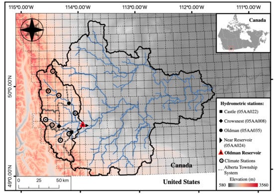 The Oldman River Basin in Alberta, Canada, with the Castle (bottom-left), Crowsnest (middle-left), Oldman (top-left), and Near Reservoir sub-watersheds upstream of the Oldman Reservoir. Climate and hydrometric stations in each sub-watershed, as well as the grids of the Alberta Township system, are presented.