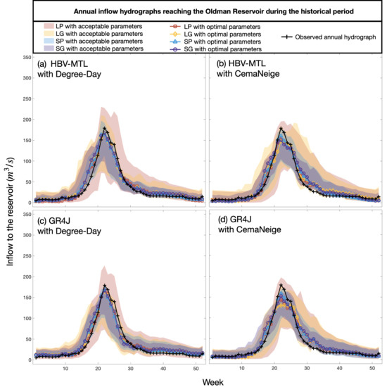 In addition to considering the KGE values, we also compared the simulated and observed inflow hydrographs for the entire historical period from 1961 to 1990 to examine how well the models reproduced the shape of the observed hydrograph. To achieve this, we calculated the expected (average) annual hydrographs for all 16 models over the 30-year period using the optimal and acceptable parameter sets identified using the GLUE method. The comparison results are visualized in Figure 2, where the x-axis represents the 52 weeks in a year. The top and bottom rows of Figure 2 display the hydrographs based on the HBV-MTL and GR4J models, respectively. The left and right columns display the results of these models, coupled with the Degree-Day and CemaNeige modules, respectively. Each panel shows the inflow hydrographs for the models, calibrated using the lumped approach and point-based (LP) and grid-based (LG) data, as well as the semi-distributed approach with point-based (SP) and grid-based (SG) data. The solid lines and shades represent the inflow based on the models with optimal and acceptable parameter sets, respectively.