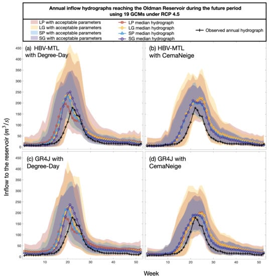 Observed and future inflow hydrographs under RCP 4.5 during 2021–2099 using HBV-MTL with (a) Degree-Day and (b) CemaNeige modules and GR4J with (c) Degree-Day and (d) CemaNeige modules, each calibrated using a lumped approach with point-based (LP) and grid-based data (LG) and using a semi-distributed approach with point-based (SP) and grid-based data (SG).