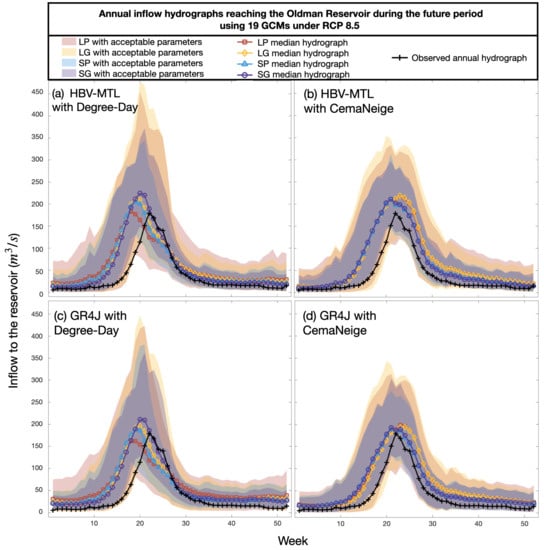 Since the performance of the hydrological models was reasonable and our strategy was to study uncertainties in water allocation stemming from modeling choices, all 16 models were used to project the streamflow reaching the Oldman Reservoir during 2021 and 2099. The annual inflow hydrographs in the future under RCPs 4.5 and 8.5 are shown in Figure 3 and Figure 4, respectively. In each figure, while the top and bottom rows present the flow for the HBV-MTL and GR4J models, the left and right columns show the results of these models using the Degree-Day and CemaNeige snow modules, respectively. In each panel, the envelopes of future inflow hydrographs are shown, considering the hydrological models with acceptable parameter sets for the lumped approach with point-based (LP) and grid-based (LG) data and the semi-distributed models with point-based (SP) and grid-based (SG) data. The medians of the envelopes are shown with solid lines. Under both future scenarios, all models unanimously projected more intense peak flows reaching the Oldman Reservoir in the future relative to the historical period. This could be due to projected increases in precipitation in the future, as noted previously. Overall, the snow module played a more prominent role than the other configurations in estimating future streamflow conditions, especially the peak flow timing and magnitude. While the hydrological models with the Degree-Day module projected intense and earlier peak flow timing, the CemaNeige module projected either similar or later peak flow timing, which could be due to the different modules’ formulated snowmelt processes. Moreover, it seems that the influence of catchment discretization and data resolution became more important using the Degree-Day module than the CemaNeige module. Indeed, the difference between the median projections using HBV-MTL and GR4J was relatively small; e.g., the difference for their peak projection was between 4–13%. The difference between the median peak flow projections of all 16 configurations could be as large as 42%. This illustrated the importance of using a multi-model approach for impact assessment.