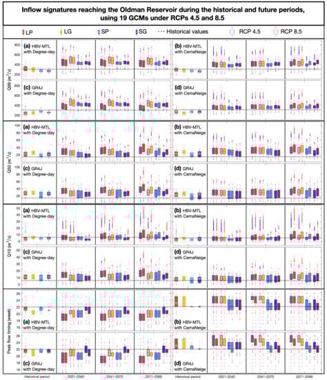 Inflow signatures during the historical and future periods. Observed values are shown with a dashed line. Simulated values are shown using the models with acceptable parameter sets: HBV-MTL with the (a) Degree-Day and (b) CemaNeige modules and GR4J with the (c) Degree-Day and (d) CemaNeige modules, calibrated using a lumped approach with point-based (LP; red) and grid-based data (LG; yellow) and a semi-distributed approach with point-based (SP; blue) and grid-based data (SG; violet). Projections based on RCPs 4.5 and 8.5 are shown with blue and red box outlines.
