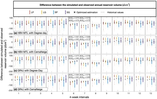Here, we first examined the disparity between the observed and simulated water volume in the Oldman Reservoir during 1961–1990, which was obtained via feeding the estimated inflow based on the 16 hydrological model configurations into the Oldman water allocation model. The KGE values for this comparison are shown in Figure 6, and they ranged between 0.69 and 0.85, demonstrating a good performance from the models. Moreover, although the difference between KGE values among the models was small, it seems that the models with the CemaNeige module, when using semi-distributed discretization and when calibrated with point-base data, outperformed the other configurations in estimating reservoir volume. To gain a better insight into the intra-annual performance of the models, the mean difference (dam3) between the observed and simulated reservoir volume, averaged over a 30-year period for all models, based on optimal and acceptable parameter sets, is shown in Figure 6. As can be seen, the performance of the models depended on the season. For instance, the HBV-MTL models better represented the historical values during the winter. Meanwhile, during early summer, when the water level is relatively high, the models with the CemaNeige module better reproduced the historical reservoir volume, and the models with the Degree-Day module performed slightly better during late summer.