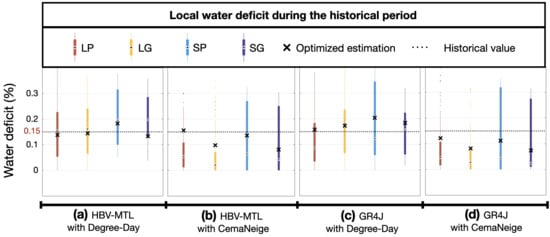 Simulated versus observed water deficit in meeting local water demand during the historical period using HBV-MTL with the (a) Degree-Day and (b) CemaNeige modules, as well as GR4J (c) with the Degree-Day and (d) CemaNeige modules, calibrated considering a lumped approach with point- (LP) and grid-based (LG) data and semi-distributed with point- (SP) and grid-based (SG) data using acceptable and optimal parameter sets.