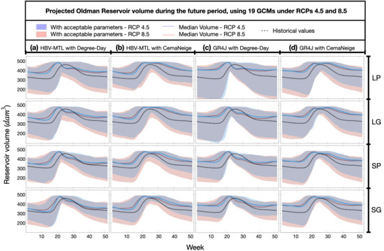Observed, as well as median and ensemble of, projected reservoir volume under RCPs 4.5 and 8.5 using HBV-MTL with the (a) Degree-Day and (b) CemaNeige modules, as well as GR4J with the (c) Degree-Day and (d) CemaNeige modules, calibrated via lumping with point- (LP) and grid-based (LG) data and semi-distributed with point- (SP) and grid-based (SG) data.