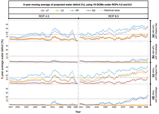 Here, we analyzed the evolution of the annual water deficit in the future and compared it with the average historical deficit of 15%. Figure 9 presents the five-year moving average of the projected water deficit using the coupled models under RCPs 4.5 and 8.5. The models with the Degree-Day module project considerably larger water deficits throughout the century than those with the CemaNeige module, which was consistent with their behavior during the historical period. Moreover, the GR4J models suggested a slightly greater water deficit in the future than the HBV-MTL models. Using the same hydrological model and snow routine, the impact of catchment discretization was more significant than data conditions. The difference between projections was evident in the forcing scenario. While most models projected an increasing positive trend (p-values < 0.05) in the water deficit by a maximum of 40% under RCP 8.5, the estimations under RCP 4 were are smaller and could be below the historical level by the end of the century. This is because, under RCP 8.5, the area’s temperature is expected to rise twice as much as under RCP 4.5 [31]. Hence, meeting the local water demand could be challenging under the high concentration scenario.