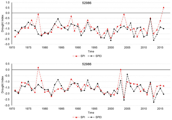 Temporal variations in the SPI and SPEI at stations 52986 and 52996.