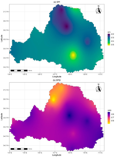 Figure 4 illustrates the spatial variations of the SPI and SPEI values with a 50-year RP in the Wei River basin, which were interpolated with the Kriging method based on station results. The results indicate that the SPEI appears to show more severity than the SPI as it takes into account the influence of temperature on drought conditions in addition to precipitation. Moreover, the SPI and SPEI exhibit different spatial features across the basin. In particular, the northwest region experiences the most severe droughts according to the SPEI, while the SPI identifies relatively milder drought severity in this area. Conversely, the central-south area exhibits the most severe droughts according to the SPI with drought severity characterized by the SPEI ranging between −2.6 and −2.7, approaching the least drought severity regions (i.e., central and southeast) as identified by the SPEI.