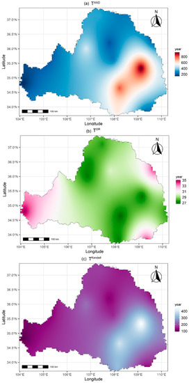 Figure 5 displays the spatial variations in the joint return periods in AND, OR, and Kendall for the SPI and SPEI with a 50-year RP in the Wei River basin, which are also interpolated with the Kriging method. Due to the distinct dependence patterns between the SPI and SPEI across the basin, the joint return periods in AND, OR, and Kendall exhibit different spatial variation features. As observed in Figure 5, the western and central-northern regions are more prone to experiencing simultaneous severe droughts characterized by both the SPI and SPEI with the TAND return periods less than 400 years. In contrast, the central-southeastern part has relatively fewer chances of experiencing simultaneous SPI- and SPEI-based droughts with the TAND return period potentially exceeding 800 years. The spatial variations in TOR present a different feature compared to TAND. It indicates that the western, northeastern, and southeastern regions are less likely to encounter a 50-year drought represented solely by either the SPI or SPEI, while the central-southeastern and northwestern regions are more likely to experience a 50-year SPI or SPEI drought. Regarding TKendall, as shown in Figure 5c, its spatial variations are similar to those of TAND but with relatively shorter return periods. This suggests that the basin may experience compound drought events with shorter recurrence intervals, highlighting the possibility of concurrent extreme drought occurrences based on the interdependence between the SPI and SPEI.