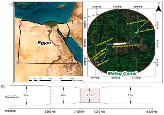 The Western Meleg Canal branches from the Bahr Shebin Canal in front of Regulator km 53.500; the canal inflows through two gates on the Bahr Shebin Canal; the width of the opening is 3 m; and the canal serves a total area of (44.1 × 106) m2. The discharge of the canal ranges from 200,000 to 250,000 cubic m per day. It extends on the right side of the Western Meleg Canal, along the Shebin Al-Kom-Berket Al-Saba road, for a distance of 1.500 km; then, the road goes away from it after 1.500 km, and it is parallel again at 2.900 km and extends parallel to the right side until the end of the canal, which is 6.230 km long. There is a parallel road on the left mainland of the canal starting at 1.500 km. The canal passes through a large population block on the right and left sides (the village of Meleg). The Western Meleg Canal feeds three canals: the Maqtaa Shamma Canal, which takes water on the left side at 2.600 km and extends 8.680 km to serve (7.98 × 106) m2; the Al-Ghouri Canal, which takes water on the left side at 6.200 km and extends 13,680 km to serve (22.26 × 106) m2; and the Al-Halfaya Canal, which drains the Western Meleg Canal (end of the canal) and extends for a length of 5.950 km to serve (7.14 × 106) m2. Figure 1a shows the location of the region of the Western Meleg Canal, as well as the locations of the Maqtaa Shamma, Al-Ghouri, and Al-Halfaya Canals. Figure 1b shows a graph of cross-sectional changes along the canal; the hydraulic and design data of the canal are shown in Table 1, and since the Western Meleg Canal is located within the national project for the lining and rehabilitation of canals, the design sector for lining these canals is (30 cm Big Cobbles + 10 cm plain concrete).
