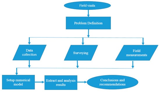 Figure 2 illustrates the research methodology employed. Hydraulic modelling was employed to assess the impact of two factors: narrowing the bed width and covering the Western Meleg Canal segment from 1500 km to 3400 km. Given that lining work had commenced on the canal, the current canal conditions were simulated using design cross-sections, and model variables were adapted to the non-lined distances. Moreover, the study examined the canal’s status after the lining process and its condition following bed width reduction and coverage.