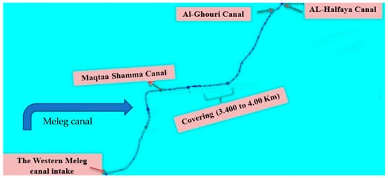 A numerical model was created for the entire length of the Western Meleg Canal, which reaches a length of 6.230 km. All the intakes on the canal were represented, including the Maqtaa Shamma Canal km 2.600, the Al-Ghouri Canal km 6.200 and the Al-Halfaya Canal 6.230 km. The numerical model was designed using the design cross-sections and data of the structures built on the canal. For the water levels and the discharges at the boundaries of the canal (boundary conditions), the hydraulic model was designed based on the maximum discharge passing through the canal (2.89 m3/s), and the Manning’s coefficient (n) was used (n = 0.03 s/m1/3) before the lining according to the unlined distances based on model calibration by the field data. Manning’s coefficient was used (n = 0.018 s/m1/3) for the case after the lining according to the Ven Te Chow tables and the previous experiences in lining. The water levels and velocities along the canal were deduced for all the study scenarios. Figure 3 shows a plan of the Meleg Canal on the numerical model.