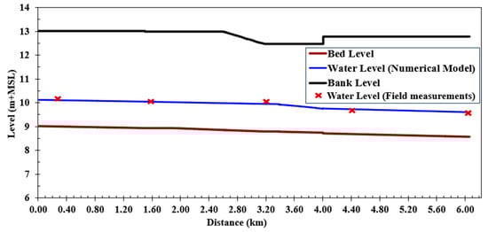 In this calibration, the Western Meleg Canal’s maximum discharge was reached, and the design cross-sections were used before the lining work. In Figure 4, the Manning coefficient of soil was established at a value of 0.03 based on the field data, which were achieved using the SOBEK model. The water levels along the canal were observed if all the intakes were shut off. As shown in this figure, they ranged from 10.35 m at the beginning to 9.62 m at the end and are very close to the design water level for the canal. On the coverage, there is a 9.8 cm difference in water pressure, and the coverage operates in free flow. The canal’s water depths range from 1.06 to 1.34 m, and its flow velocities range from 0.36 to 0.62 m/s.