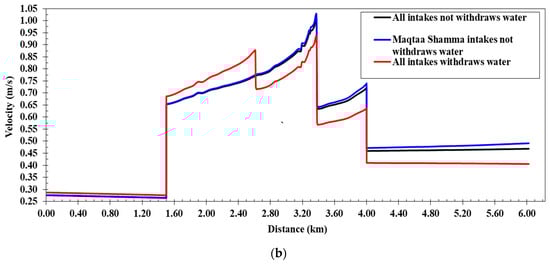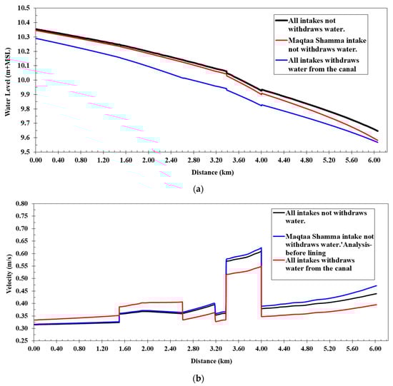 In this scenario, Figure 6a shows a comparison between the water levels of the cases of operation (a, b, and c) along the Western Meleg Canal after lining and shows that the water levels along the canal, as inferred from the numerical model, varied from 10.12 m at the beginning of the canal to 9.58 m at the end. They were lower than the water levels before lining to increase the velocity after the lining works. The flow velocities along the canal ranged from 0.39 to 0.72 m/s, and the water depths in the canal varied from 1.02 m to 1.16 m. The water pressure difference increased the coverage to 13.9 cm, and the coverage was still under free flow when the maximum discharge of the Western Meleg Canal was passed. The canal’s design cross-sections were used after lining works with a Manning roughness coefficient of 0.018, and the water levels along the canal were calculated if all canal intakes were closed. Figure 6b shows a comparison between the flow velocities of the cases of operation along the canal. It is clear from the comparison of the water levels that the maximum water levels occurred when the maximum discharge was passed and without operating the intakes. The flow velocities along the canal in this case ranged from 0.37 to 0.64 m/s, and the water pressure difference on the covering was less than 11.14 cm. Water levels ranged from 10.11 m at the beginning of the canal to 9.54 m at the end when the Maqtaa Shamma Canal intake was closed and only the Al-Ghouri and Al-Halfaya Canal intakes were operating. In this case, the flow velocities along the canal ranged from 0.40 to 0.74 m/s. The maximum velocity appeared at the entry to the coverage if the difference in water pressure on the coverage was 14.83 cm. The speeds rose, and the water depths reduced, as compared to before and after lining. Thus, when lining the canal, the width needs to be reduced to maintain the canal’s water level.