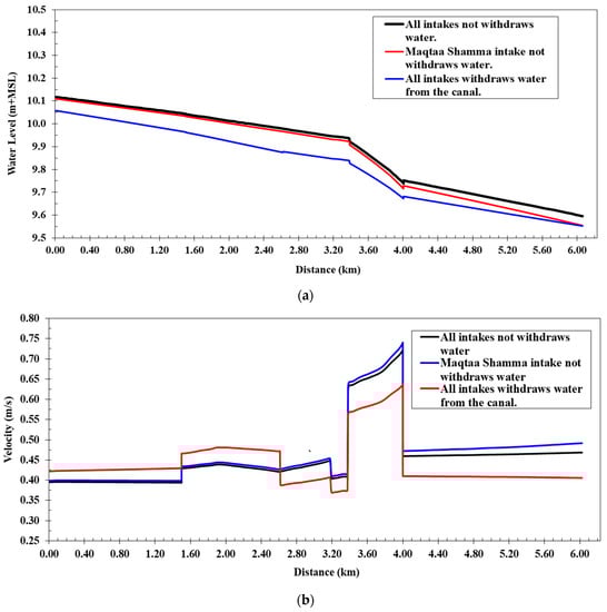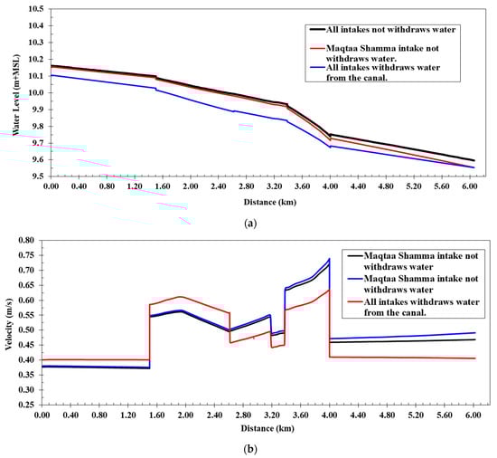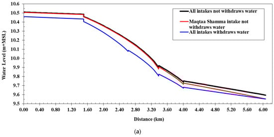 The numerical model of the Western Meleg Canal was executed after inputting all relevant data, and it utilized Manning’s coefficient values for four distinct scenarios. These scenarios were evaluated using the designated cross-sections. The maximum canal discharge observed was 2.89 m3/s in three cases: (a) in the absence of water withdrawal from side intakes along the canal; (b) with the closure of the intake at the Maqtaa Shamma Canal (at 2.600 km), while the intakes at the Al-Ghouri Canal (at 6.210 km) and Al-Halfaya Canal (at 6.230 km) were operational; (c) with the operation of all intakes along the Western Meleg Canal, including the Maqtaa Shamma Canal, Al-Ghouri Canal, and Al-Halfaya Canal.