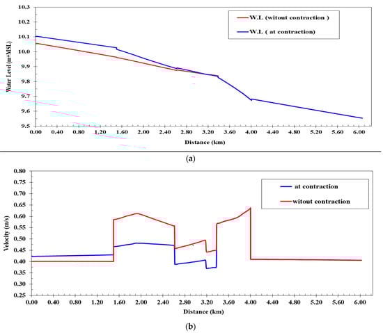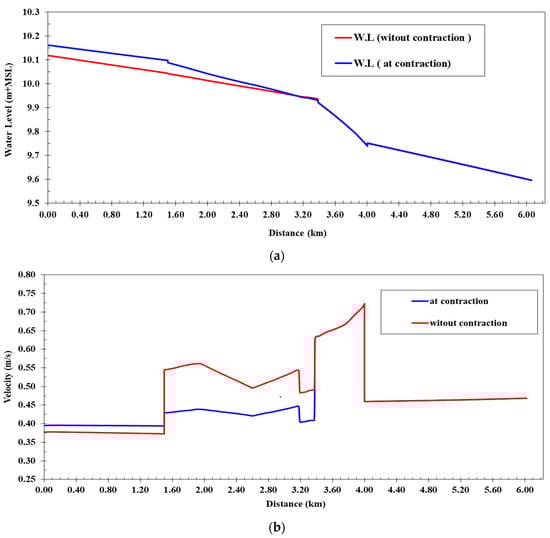 All intakes on the canal were closed before and after the bed width contraction at the maximum discharge: (a) water levels; (b) flow velocities.