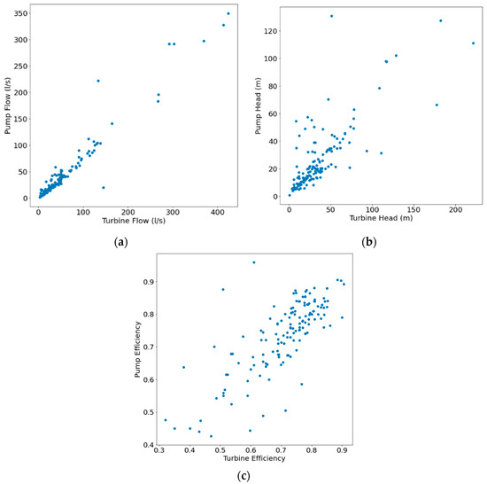 Figure 2. All plots show a linear trend with the strongest being the flows and the weakest being the efficiency. It should also be noted that most of the flow rates range from 0 to 150 L/s, and a similar density trend in the head ranges from 0 to 90 m. As these datapoints fit within the typical and expected ranges of a PaT, the information beyond the maximum range is sparse and more sporadic in nature.