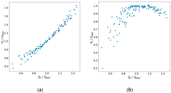 Figure 5a,b. Efficiency curve results are more scattered, being better fit when normalized values are closer to 1, i.e., turbine efficiency is close to the BEP. For efficiencies between 50 and 80% of the BEP, the models generally overestimate efficiency. There are also less data in this range. Thus, these models may be improved by adding more data regarding PaT performance at lower efficiencies.
