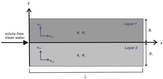 Researches on transport in layered heterogeneous aquifer systems can be categorized more or less into two groups: one in which the flow direction is perpendicular to the direction of layering, for which breakthrough curves are typically predicted using time convolution, assuming that interactions between layers do not significantly impact transport []; the other group involves that the flow direction is parallel to the layering, which will be the focus of this study. Layered heterogeneous media refers to geological or porous materials that exhibit variations in properties, such as grain size, hydraulic conductivity, or porosity, within different layers or regions. Layered heterogeneous media include structured soils [,], fracture-matrix systems [,,], and aquifer-aquitard systems [,,]. These variations in properties result in nonuniform flow patterns within the porous media, often described as preferential flow, signifying that water and solutes move at different velocities in various layers or strata within the soil [,]. The concentration difference among different layers would become inevitable, and intra-layer mass transfer will occur, driven by the vertical dispersive transport. Therefore, when the flushing method is applied to a multi-layered system, the efficiency of flushing is not only related to the flow and transport parameters of individual layers but also closely related to the intra-layer mass transfer rate. To understand the most important controlling mechanism of the flushing method in a multi-layer system, this study used the two-layer aquifer system as an example. The reason to choose the two-layer aquifer system is that it is the simplest multi-layer system and has been commonly seen in the actual setting as well, such as the aquifer-aquitard system and the fracture-matrix system.
