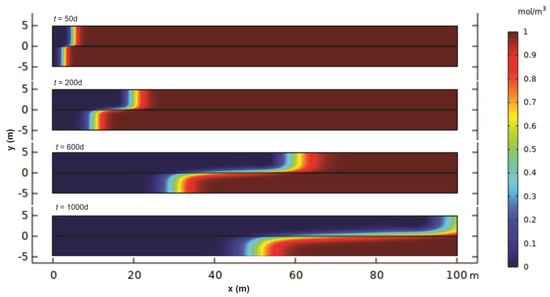 The flushing process was investigated by recording its status at different time intervals (50th, 200th, 600th, 1000th days) using an example case, which was characterized by the following properties: , , , , , , , which was the same for both layers, , , . One can see that because the porosity of layer-1 was half of the porosity of layer-2, the average groundwater flow velocity along the x-axis in layer-1 was twice of that in layer-2, as the Darcian flow velocities (q) in both layers were the same. Therefore, layer-1 was regarded as the faster flushing layer and layer-2 was regarded as the slower flushing layer hereinafter. The vertical dispersivity values for both layers were assumed to be 1/10 of their longitudinal counterparts. Figure 2 presents the concentration distribution at various times, revealing that the solute in layer-1 consistently preceded that in layer-2, while the gap between the two layers increased over time.