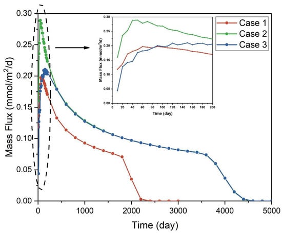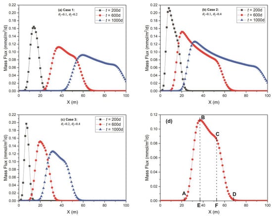 Case 1 is a base case that was used to compare with Cases 2 and 3 in the following, and so, it is discussed first. Figure 3a presents several noteworthy observations about Case 1. Firstly, the maximum value of the mass flux continuously decreased over time. For instance, the peak mass flux was 0.165 mmol/m2/d at x = 14 m for t = 200 d, while it was 0.112 mmol/m2/d at x = 37 m for t = 600 d. Secondly, mass flux appeared as an asymmetric bell-shape distribution with distance of x at any given time, with a steeper rising limb, a relatively flat top, and a less steeper falling limb. For instance, the range of the flat top was not apparent for t = 200 d, but for t = 600 d, it can be seen from x = 37 m to 58 m with a range of 21 m. Thirdly, as time passed, the range of the relatively flat tops increased. For example, when t = 600 d, the range of the flat top was 21 m (from x = 37 m to 58 m). For t = 100 d, the range increased to 38 m (from x = 60 m to 98 m).