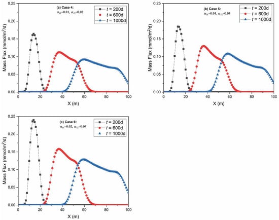 Based on Figure 5, several noteworthy observations can be made. Firstly, as illustrated in Figure 5a,b, the peak value of mass flux increased with the increase in transverse dispersivity in layer-2 for any given time. For example, at t = 200 d, the peak value of the mass flux was 0.165 mmol/m2/d in Case 4, while it was 0.185 mmol/m2/d in Case 5. On the other hand, increased transverse dispersivity of layer-1 also increased the peak value of the mass flux at a given time when inspecting Figure 5b,c. For instance, the peak value of mass flux was 0.185 mmol/m2/d at t = 200 d in Case 5, which was 0.240 mmol/m2/d in Case 6.