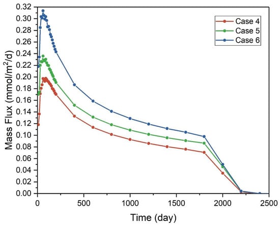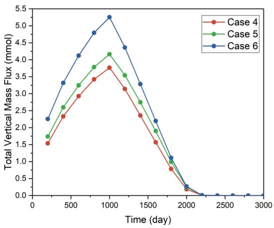 In Figure 5, the areas beneath the curves and the x-axis collectively represent the total vertical mass flux across the interface of two layers at a given time. To further investigate the total mass flux over time in different cases, we recorded the time-varying total mass flux, as depicted in Figure 7, while maintaining consistent aquifer properties as detailed in Section 3.4.1. Our observations yield noteworthy insights based on Figure 7. Firstly, all three curves exhibited an initial increase, culminating at their zenith (t = 1000 d), followed by a subsequent decline until the total mass flux reached zero. Secondly, prior to reaching zero, the total mass flux of Case 4 was consistently the smallest, while Cases 6 consistently exhibited the largest value. For example, the peak total mass flux for Case 4 was 3.767 mmol, for Case 5, it was 4.163 mmol, and for Case 6, it was 5.253 mmol.
