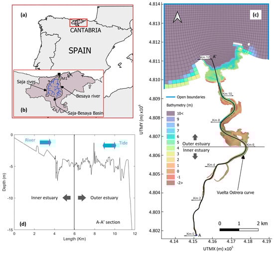 (a) Location of Cantabria in Spain and (b) the Saja-Besaya river basin, (c) bathymetry used in the 3D hydrodynamic model, the model mesh grid and the open boundaries and (d) longitudinal section of the Suances estuary (A-A′ profile).