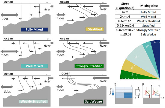 From this literature review, it has been observed that there is a straightforward relationship between the vertical mixing classes and the density or salinity profile slopes of the water column (whenever salinity is the fundamental parameter affecting density). After the analysis of these data, the slope ranges for each vertical mixing class were established: fully mixed (), well mixed (), weakly stratified (), stratified (), strongly stratified () and salt wedge ().