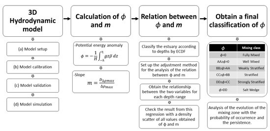 The application of this classification to estuaries is performed by the four-tiered method presented in Figure 3. In Tier 1, a 3D hydrodynamic model with high spatial resolution is calibrated and validated (see Section 2.1). Then, in Tier 2, the ϕ and m-values are calculated for every grid cell at each time step. In Tier 3, the relationship between ϕ and m is determined. Lastly, in Tier 4, the ϕ-values are classified into six vertical mixing class by means of the fitted curve and the proposed m-thresholds for every vertical mixing class.