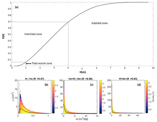 Results of the ANN adjustment. (a) ECDF function of the depths of each estuarine cell over the simulated period and the proposed depth ranges to distinguish between estuarine zones; density scatter of the ϕ and m-values from the results obtained from the model simulation and curve fitted by ANNs (black lines) in the tidal marsh zone (b), intertidal zone (c) and subtidal zone (d).