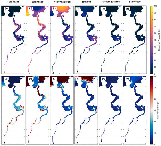 Occurrence probability (a–f) and maximum persistence in hours (g–l) for each vertical mixing class in the Suances estuary: fully mixed (a,g); well mixed (b,h); weakly stratified (c,i); stratified (d,j); strongly stratified (e,k) and salt wedge (f,l).