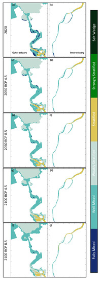 On the other hand, in the projected 2100 RCP 4.5 scenario, the stratification zones have expanded in the intertidal zone and main channel, from km 4 to km 2 of the A-A′ section (see Figure 1a,d). Although, in the projected 2100 RCP 8.5 scenario, there is a displacement of areas classified as stratified upstream of the estuary, due to the change in forcing, more pronounced in the scenarios projected for 2100 [26].