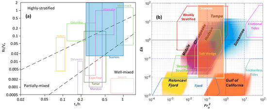 Variability of vertical mixing classes in the Suances estuary based on the diagram proposed by (a) [24] and (b) [25]. Figure adapted with permission from Ref. [24], 2021, Elsevier and from Ref. [25], 2021, Elsevier.