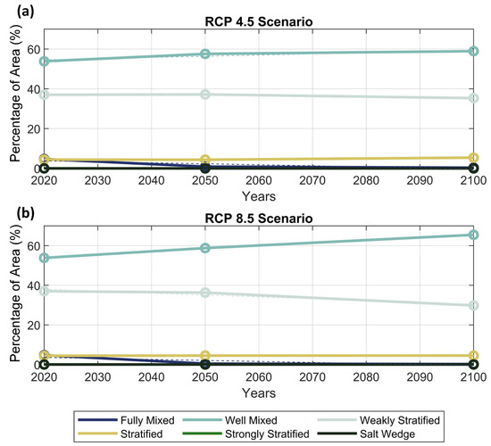 As shown in Figure 8, the fully mixed and weakly stratified zones tend to disappear because their m-terms are negative for both scenarios (RCP 4.5 and RCP 8.5). Moreover, it can be observed that this trend is similar in both scenarios. This may be associated with a decreased freshwater inflow to the estuary and increased tidal excursion along the estuary, producing a shift of the river/estuarine front upstream of the zones in line with the results observed by [69], which leads to the fully mixed zones disappearing. On the other hand, there is an increase in the number of zones classified as well mixed, especially in the RCP 8.5 scenario. Finally, the zones classified as stratified tend to remain the same or increase slightly in the RCP 4.5 scenario.