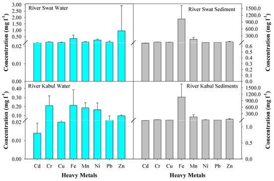 The heavy metal concentrations in sediment samples collected from River Swat and River Kabul are given in Figure 2 and Tables S1 and S2. The mean Cd, Cr, Cu, Fe, Mn, Ni, Pb, and Zn concentrations in River Swat sediment samples were 0.65, 17.55, 11.75, 1036.70, 145.44, 3.80, 4.75, and 31.65 mg/kg, respectively (Figure 2). Cd concentrations for samples S1, S2, S3, S4, and S5 were 1.5, 0.5, 0.25, 0.25, and 0.75 mg/kg, respectively (Table S1). The Cd concentration was higher than the Environment Canada standard [32] (0.68 mg/kg) for samples 1 and 5, while samples 2, 3, and 4 were found in the range. Similarly, Cd concentration exceeded the NOAA limit (1.2 mg/kg) [33] for sample S1, while S2, S3, S4, and S5 were within the limits. Additionally, all the samples were found within the permissible limit of USEPA (>6 mg/kg). Ni concentrations for all the samples were within permissible limits of Environment Canada standards (15.9 mg/kg), NOAA guidelines (20.9 mg/kg), and USEPA guidelines. Zn concentrations were also found within the permissible limit of Environment Canada (124 mg/kg), NOAA (150 mg/kg), and USEPA (>200 mg/kg). Other heavy metals, including Cu, Cr, and Pb concentrations, were within the permissible limits of Environment Canada [32], NOAA [33], and USEPA [34] guidelines for all five samples.