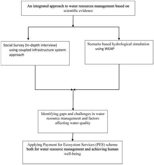 To accomplish effective water resource management, multiple methods and tools have been utilized to evaluate the processes governing the evolution of water resources (including both quality and quantity) at any particular location. However, there are many physiological, socioeconomic, and institutional linkages in the global water system. Addressing water pollution cannot be solved by traditional water management strategies alone. Integrated approaches and institutional change (i.e., horizontal and vertical integration) are needed. Examples include sustainable management [7,8], ecosystem services [9,10], payment for ecosystem services (PES) [11], and policy governance [12,13,14]. Using an integrated approach of field survey, laboratory analysis, statistical analysis [15], and hydrological simulations [16,17] for the hydrological research and the expected result is helpful for both the scientific communities and policy-makers.