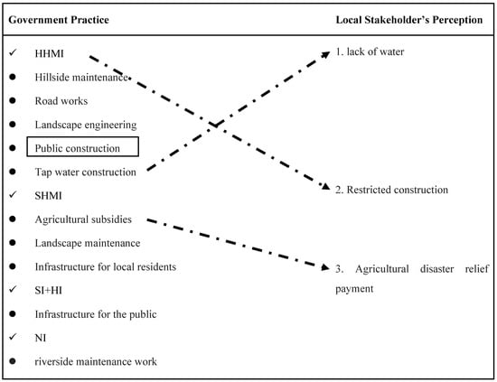 The policymakers need to consider the range of challenges and opportunities that climate change may pose and make decisions under high levels of uncertainty to achieve resilient cities [44]. Here, we review Taiwan’s Pinglin District, which is tasked with protecting the freshwater resources and water quality of the greater Taipei region’s 5 million people from destruction and pollution. The researchers compiled the interview data of 35 key informants and painted a picture in the form of three identified gaps between government practices and local stakeholder’s perceptions (in Figure 4). With the interview results, it was found that the local people are very concerned about water shortage (whether it is regarding their livelihood or agriculture), limited infrastructure development to cater to water quality improvement, and they sincerely hope that the government can provide improvement measures. The degree of social fit is biased towards the needs of urbanites but is less than that of local stakeholders.