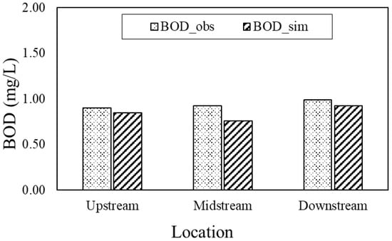 Before a WEAP model can predict future scenarios, it must be calibrated and validated with test data. The entire WEAP module is mainly focused on the water quality component. In this study, model evaluation was performed using information on BOD. Model validation for BOD is shown in the bar graphs of Figure 6. The simulated BOD has a strong correlation with the correlation coefficient (R2) = 0.93 and the average error is approximately 5%. After completing validation with significant statistical values, we performed simulations for future water quality.