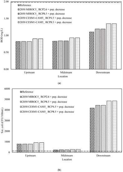 Results show simulated water quality parameters: (a) BOD; (b) total E. coli for future scenario without adaptation measures.