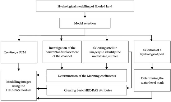 The scheme of hydrological modeling using the HEC-RAS module was developed by the authors and is shown in Figure 1.